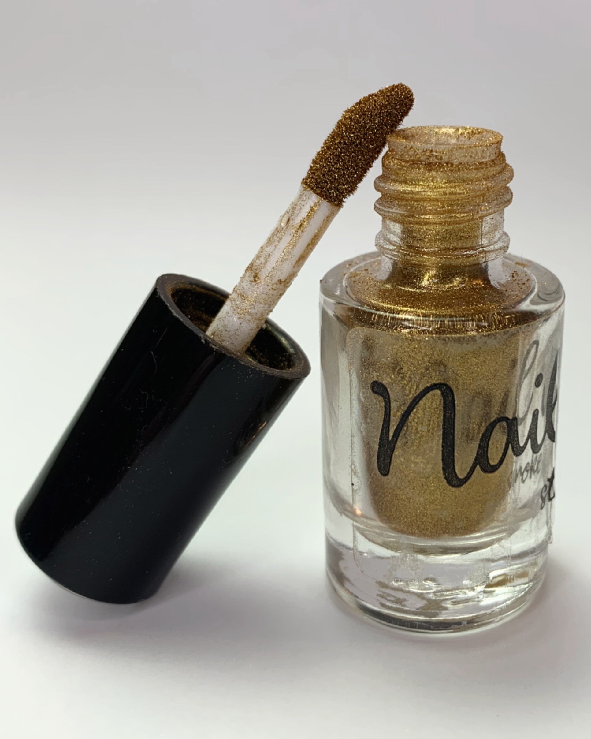 Apply a layer of no wipe gel topcoat. Unscrew cap, tap up and down on cap to remove excess powder